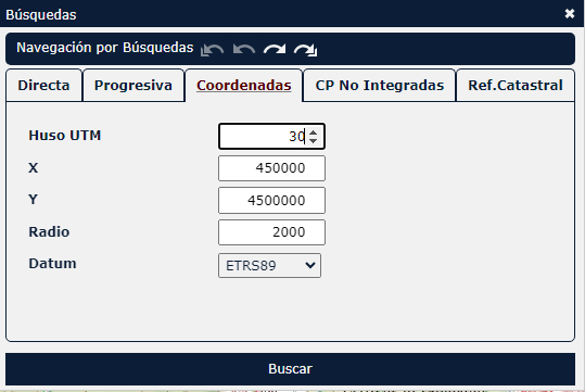 Se efectúa especificando el huso, las coordenadas del punto a localizar (que se mostrará en el centro de la pantalla) y el radio de visualización: