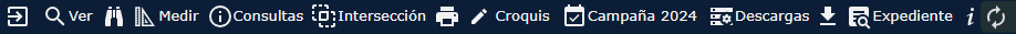 3. Barra de herramientas En este apartado se explican todos los botones y funciones de la barra de herramientas del visor: Salir de la aplicación Ver Buscar Medir Consultas Intersecciones Imprimir Croquis Campaña Descargas Desconectado Descargas Declaración gráfica de un Expediente Información Actualizar